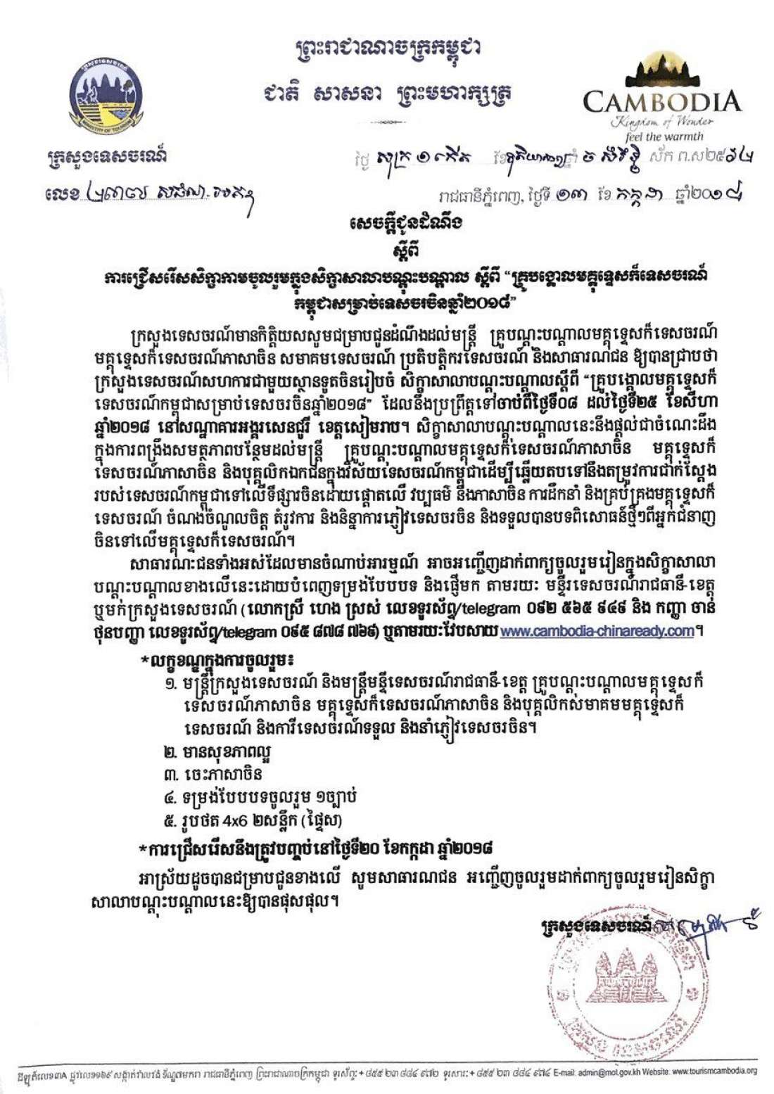 សិក្ខាសាលាបណ្តុះបណ្តាល ស្តីពី “គ្រូបង្គោលមគ្គុទ្ទេសក៍ទេសចរណ៍កម្ពុជាសម្រាប់ទេសចរចិនឆ្នាំ២០១៨”